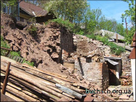 14, за будинком була збудована підпірна кам’яна стіна з господарськими прибудовами, під замковою горою. Таких підпірних мурів у Бучачі безліч. На Великодні